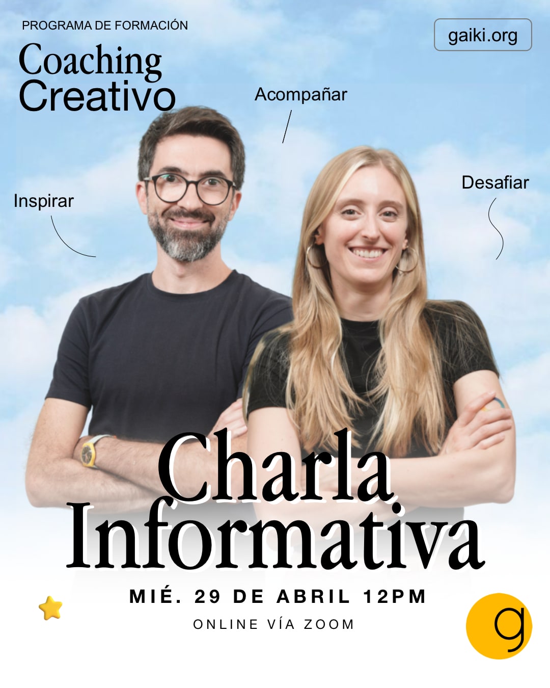 Te invitamos a conocer todos los detalles de la nueva edición de Coaching Creativo en una charla abierta junto a Facundo Arena y Florencia Ortelli. ¡Será una gran oportunidad para conocernos y aclarar todas tus dudas! La cita es el Miércoles 29 de Abril a las: