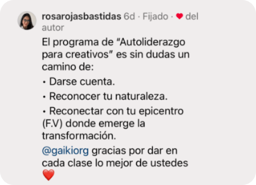 ¡Hola! Soy especialista en creatividad, innovación, y procesos de transformación cultural. Soy autor de los libros “El Camino de la Creatividad“, “Crear o Reventar“, “Robar el Fuego” y Fundador del Laboratorio Gaiki. Desde el 2017 acompaño a creativos y creativas de todo el mundo en sus procesos de exploración y desarrollo personal. En el Autoliderazgo para Creativos te propongo que recorramos juntos el camino del autoconocimiento y del desarrollo de habilidades que te permitirán articular el potencial creativo que mora en ti.